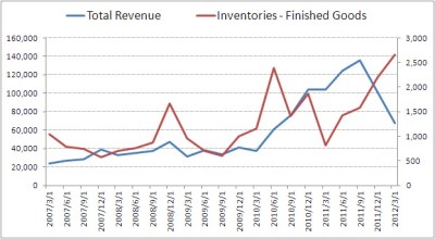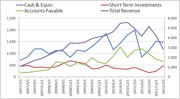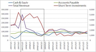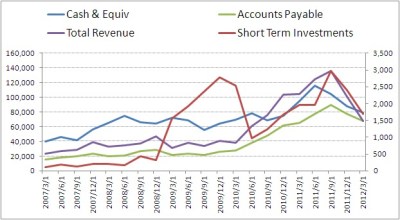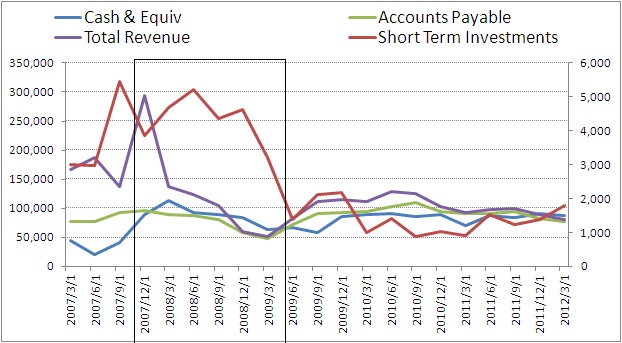 隨著營收轉弱,現金也變弱,短投也得拿來變現,以支付流動負債,RIM也有同樣狀況: