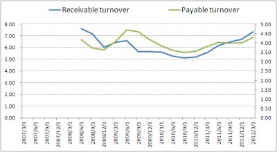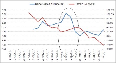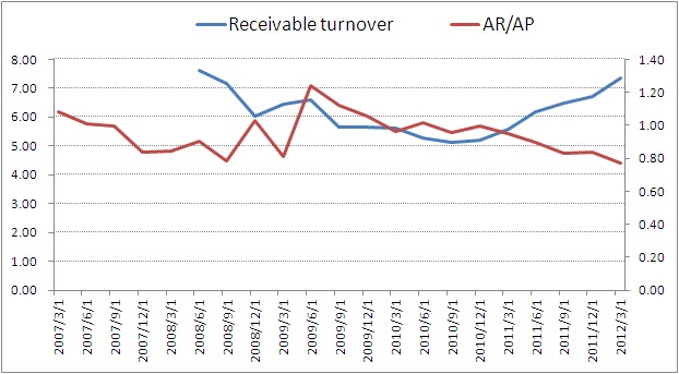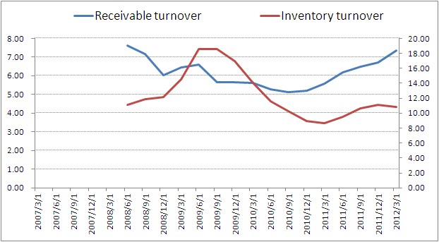 首先,引起我好奇新的是宏達電的應收帳款周轉率,過去四季大幅改善,照理說,這是好情況,表示收現能力不但好,也沒有因為營運不佳而變差,但這也很奇怪,通常營運變差,回收應收帳款的能力也會變差,但HTC沒有發生這種情況,請看下圖:
