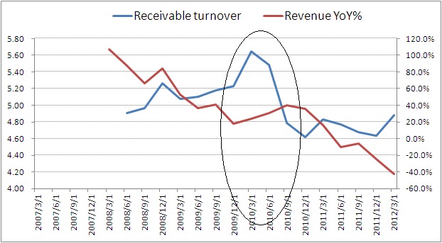 看到這個,還真是想要買,但總覺得怪怪的,所以想驗證一下其他的公司,看是不是應收帳款回收率改善,表示營運有轉機,請看宏達電同病相憐的兄弟RIM (接下來都會拿RIM做比較):