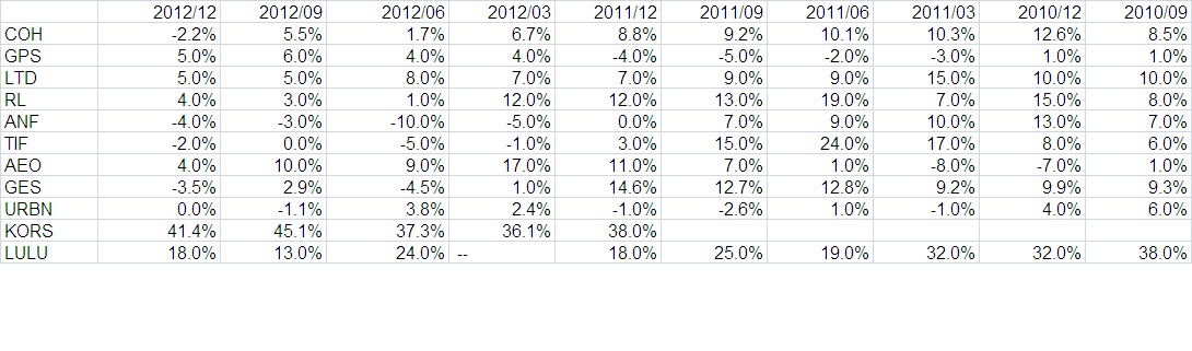 Historically, fashionable companies can somehow defy economic headwind as they have brand power. Consumers interested in luxury goods are also more affluent. Comparing Coach’s peer performance can tell us whether Coach is especially weak last year. The selected peers are based on COH’s proxy statement.